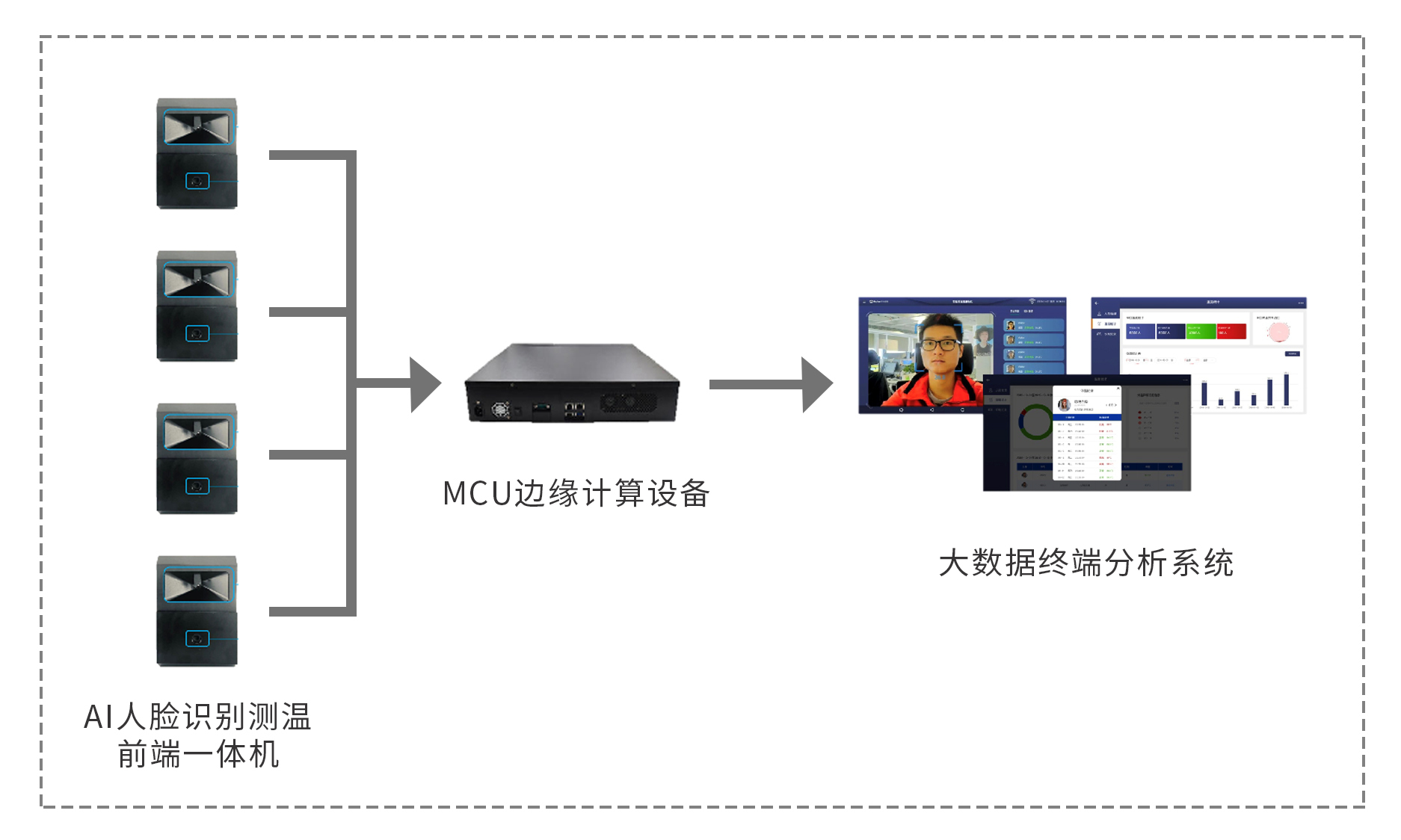 “AI熱成像測溫疫情防控系統”通過部署紅外攝像機+醫用測溫傳感器的方式獲得人體溫度,其中醫用測溫傳感器采用德國進口醫學溫度傳感器,檢測精度高達±0.1℃。再結合E20通力計算平臺+ECU邊緣計算節點,通過邊緣計算加護,迅速智能鑒別人流中的高溫人員,再根據疑似發燒者的人體、人臉信息,利用人工智能技術輔助工作人員快速定位體溫異常者,實現無感無接觸式體溫異常篩查和預警,有效降低檢測的工作量。