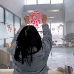 同事開始裝點公司年味氣氛開始掛燈籠,貼窗花