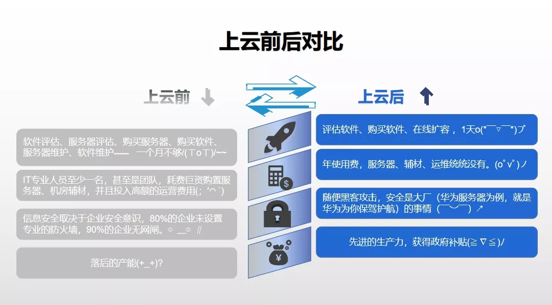 企業(yè)上云的好處是顯而易見的,企業(yè)不需要把過多的精力放在IT基礎(chǔ)設(shè)施層面,而是把更多的精力放在業(yè)務(wù)創(chuàng)新上面。在云計算火爆的今天,企業(yè)需要考慮的不是要不要上云,而是如何上云和用好云。在效率、成本、安全、收益方面上云前后的變化非常明顯。以一個和IT有關(guān)的項(xiàng)目為例: