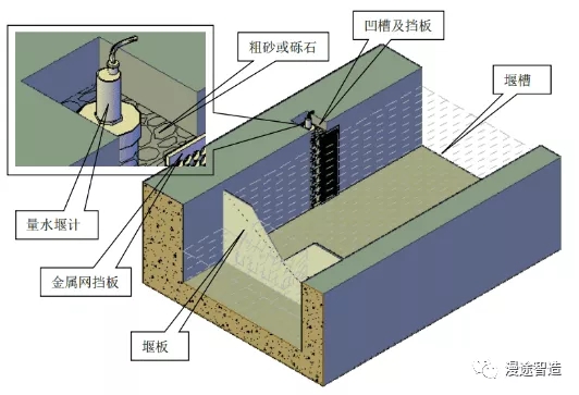 一般設置在集水溝的直線段上,上下游溝底及邊坡需加護砌以免漏水,可建造專門的混凝土或砌石引水槽。設計堰下水深低于堰口,造成堰口自由溢流。為了獲得準確的觀測成果,堰壁需與引水槽和來水方向垂直,并且直立。堰板采用不銹鋼板制成,表面應平整光滑,將堰口靠下游邊緣制成45°角。量水堰的水尺應設在堰口上游,離堰口距離為3~5倍堰上水頭,水尺刻變度至0.1mn,為使量水堰上游水流穩定,可在水尺上游安裝穩流設備。