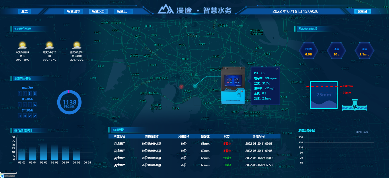 無錫某市政合作單位和漫途共同治理城市管網污水管控,打造一套城市管網污水監測系統。利用物聯網技術、無線傳感器技術對城市管網污水水質、液位、流量等參數進行實時監測,實現城市內澇、污水溢流、工業廢水偷排、工業廢水超標排放、雨污混流有效監管,精準定位,助力城市管網建設與發展。