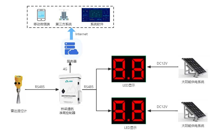 系統主要包含通航凈高監測和AIS糾偏主動預警兩部分組成。 通航凈高系統主要由雷達液位計、通航凈高主控制箱、通航凈高顯示屏、太陽能供電系統等部分組成。采用高精度雷達液位計實時采集橋梁的通航凈高,并經通航凈高主控制器邊緣處理后將凈高值實時推送值LED顯示屏進行本地化顯示,方便船只及時調整航行水位。糾偏主動預警采用AIS智能設備實時監測方圓3公里內輪船的位置、航向等信息,當出現偏航主動預警通過VHF廣播通知來船及時調整,同時將預警信息通過4G發送到云端進行存儲并推送相關管理人員,本地與云端相結合,切實保障通航安全。