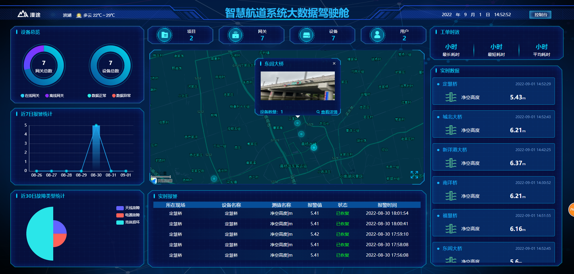 通航凈高是涉及到船只安全通行和橋梁安全。根據《內河交通安全標志GB13851》等標準和規范的規定,為保障船舶和橋梁等過河建筑物自身的安全,設置實時通航凈空高度信息警告(或提示)標志是十分必要的。為了確保東閭大橋的通航安全,根據客戶要求無錫漫途科技自主研發了“橋梁通航凈高度監測系統”能夠實時監測橋梁通航凈高,確保船只通航安全。系統物聯網技術為支撐,通過系統建設達到橋梁通航凈高監測自動化監測,減少由于橋梁凈高問題、水深問題導致的事故,動態及時準確了解通航凈高信息、以及是否符合當前航道等級,保證航道通航安全暢通,為異常情況的決策提供依據。加強對航道通航能力。