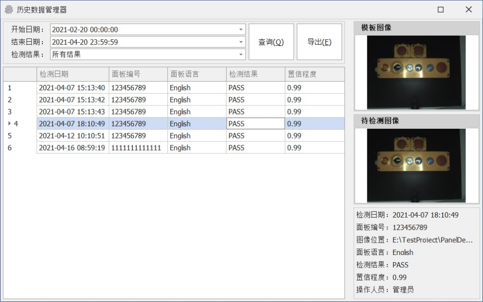 歷史數據:對每次檢測的結果進行本地保存,可自定義查詢條件對以往檢測歷史進行查看、也可導出查詢結果備案;
