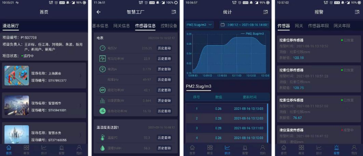首頁:APP支持實時顯示當前賬號下的所有項目及項目狀態等,并支持點擊查看對應項目的詳細內容;支持項目進入查看對應設備的實時監測參數數據、項目分布GIS地理位置、控制設備支持遠程控制、采集設備數據實時顯示,并支持點擊查看單個設備的參數歷史曲線分析;