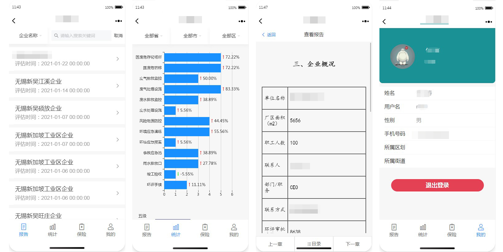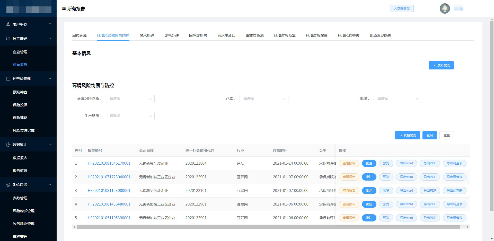本著環境保護的高度社會責任感,漫途科技為其搭建環責險現場勘查與評估系統,對企業環境污染風險等級評估報告進行管理,支持評估單位完成報告編寫、企業風險等級評估等工作,同時支持對報表數據進行實時統計,并以地圖看板方式將風險快速識別,提供可視化大數據看板,及時對風險較高的企業進行整改。同時企業自身、環保部門、保險公司可通過EHS安全監測,實時查看企業生產狀況,實時監測環境的廢水、廢氣、固危廢等固有風險。通過查看歷史統計數據,為企業投保提供可靠的依據,同時還可以提前預警,達到大限度降低環境污染事故發生目的。