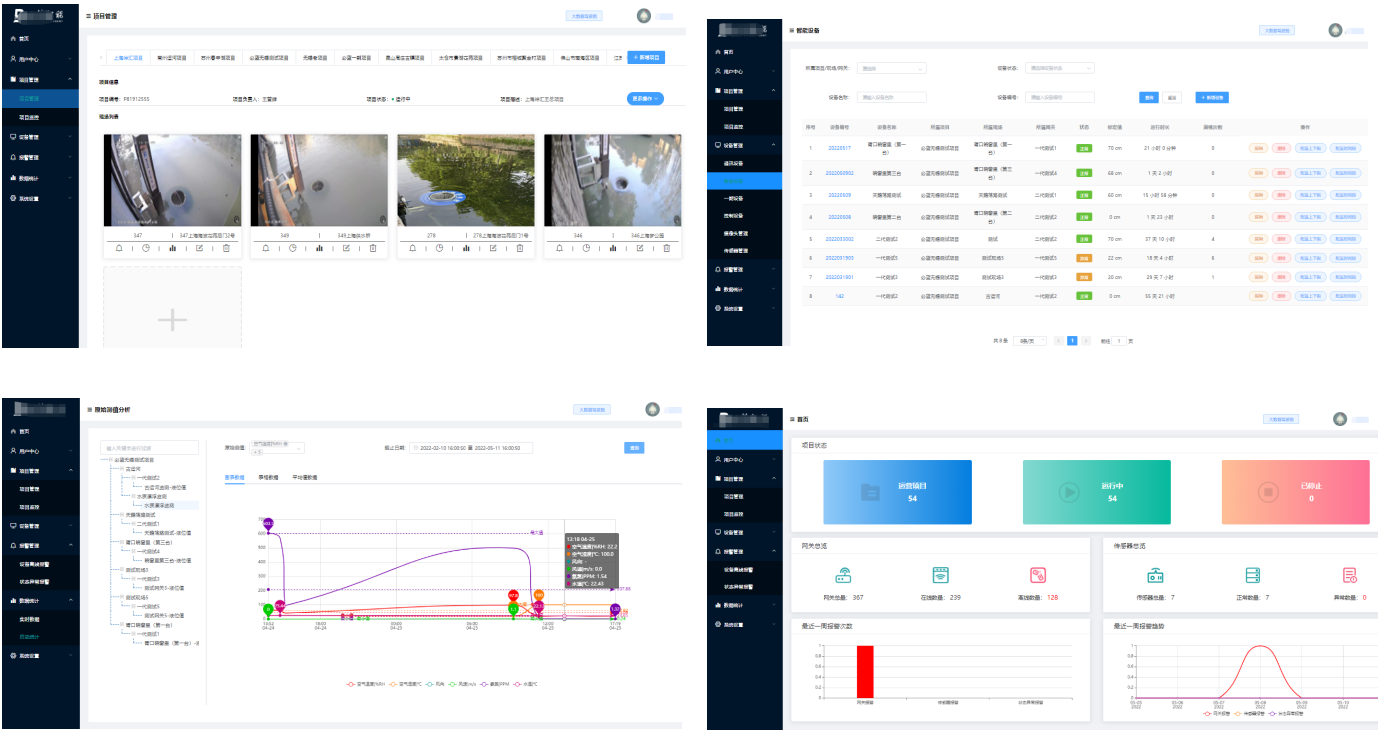 v 可視化看板:實時顯示當前總安裝數量、總運行數量、滿桶次數、總電量、總收集量等統計信息;顯示水質監測實時數據;實時顯示報警數據;垃圾總收集量月度統計。