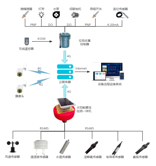 水面垃圾收集器在線監測系統主要包含水面垃圾收集器控制器及太陽能懸浮監測一體機,垃圾收集器通過對水泵、燈帶、升降電機進行開關控制實現水面垃圾自動收集,配合液位傳感器自動調節設備的水面高度,同時采用本地遙控器調節與遠程APP控制,配套使用太陽能懸浮監測一體機,對監測水域內風速、風向、溫濕度、水體溫度、溶解氧、氨氮等參數實時監測,數據通過4G網關發送至云服務進行分析處理,方便運維人員進行設備遠程運維,建立完整的生態管理體系,保護水體生態環境。