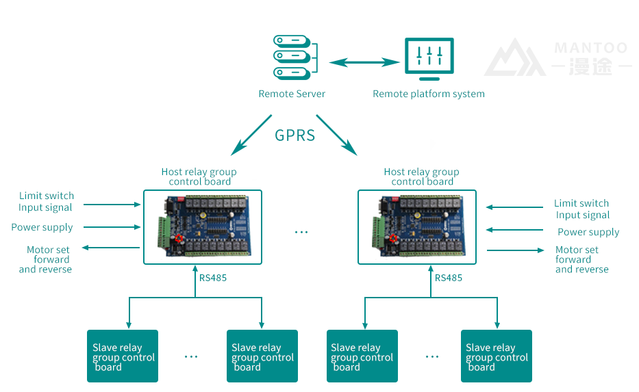 Product introduction:The remote relay controller is composed of a circuit board containing 8 sets of relays, a total of 16, controlling 8 sets of motors, 2 sets of each, a total of 16 motors, each set of relays controls the forward and reverse rotation of each set of motors, each set has 4 Normally closed limit switch, two left and right limit switches, the power of the limit switch is controllable, the signal output is 12V, the system adopts the master-slave mode, the master-slave device communication method is RS485, the master device communicates with the server through GPRS mode Remote control commands, feedback control command results, each board number is unique, set through the serial port.