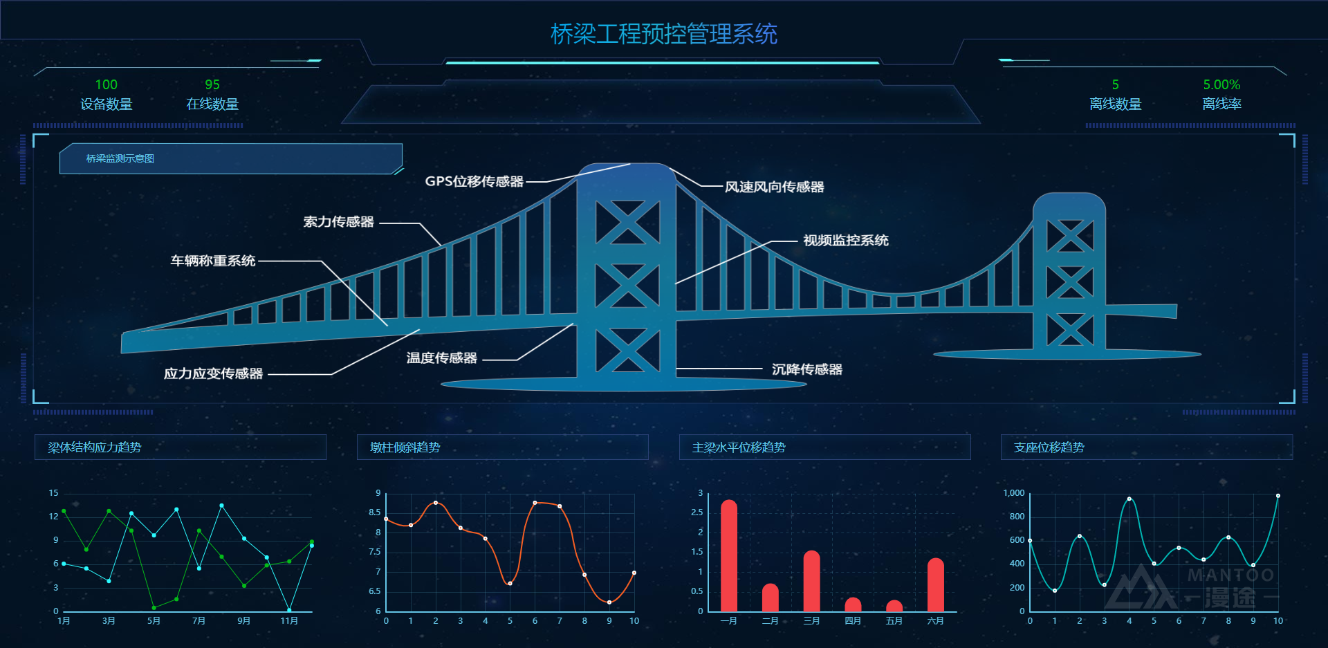 MANTOO 's intelligent bridge safety monitoring system can immediately report the bridge's specific parameters such as cracks, vibration, stress, horizontal displacement and inclination angle to the cloud platform for the next analysis; this step greatly reduces our company Operation and maintenance costs. At the same time, the monitoring value is more continuous and has a high analytical value; the bridge safety monitoring and preventive maintenance early warning system play a major role in the daily maintenance, management and emergency response of the bridge, which is worthy of recognition.