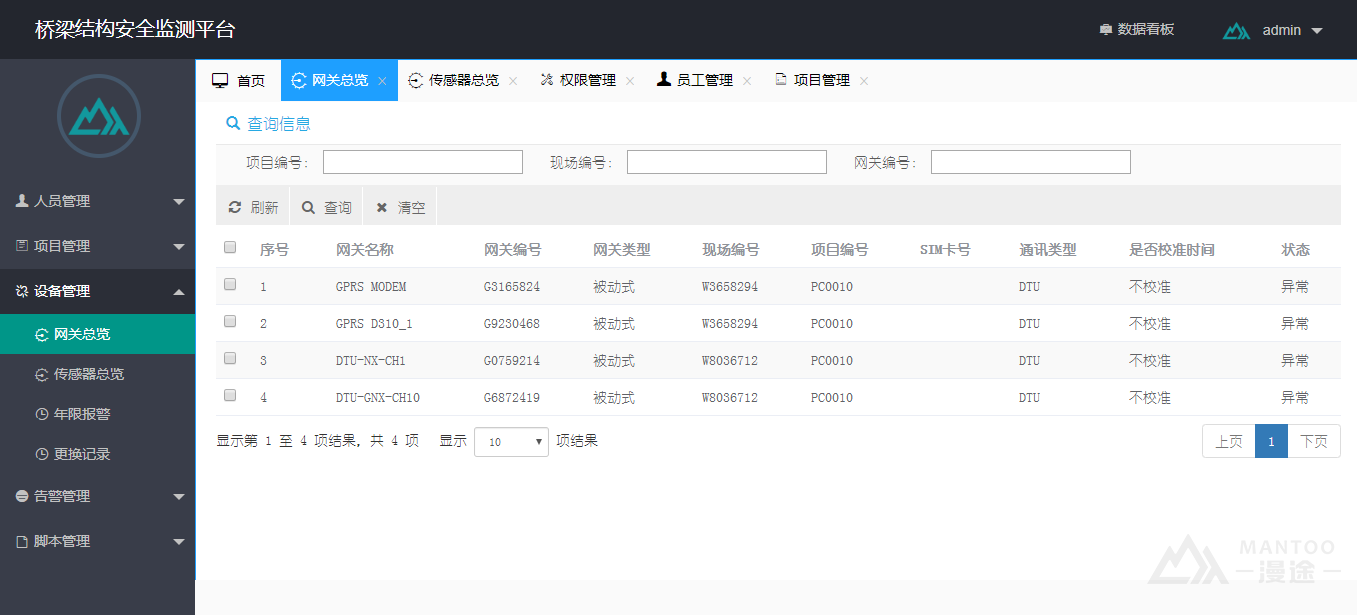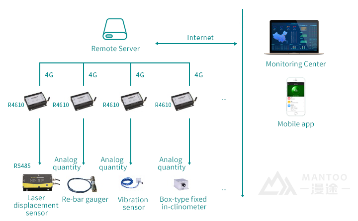 MANTOO, as an industrial Internet of Things service provider integrating R & D and intelligent manufacturing capabilities in the Yangtze River Delta region, according to the needs of the construction company, uses wireless automation collection, wireless data transparent transmission, and intelligent early warning technology, with MT-R4610 intelligent measurement and control terminal , Developed a BSM bridge structure safety predictive maintenance system that integrates safety monitoring and preventive maintenance early warning functions. Play a major role in the daily maintenance, management and emergency response of bridges