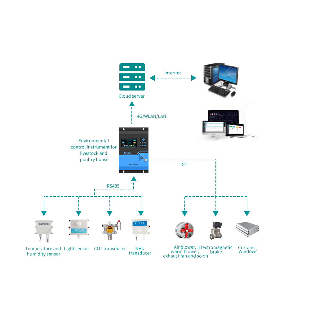 Corral environment controller is integrated with RS485 interface, Ethernet front-end ports, multi-channel switch input, multiple relay output and wireless data communication in the integration of high performance equipment, can real-time acquisition environment monitoring sensor data on the spot, and sends the data to the remote monitoring platform, can be all kinds of control device for remote control on the spot, support local online hd touch screen display, data storage, local historical data view, parameter Settings. It is used in the system to collect on-site environmental data and device control, connect to on-site WIFI hotspots through WIFI, and upload data to the cloud platform steadily and quickly.