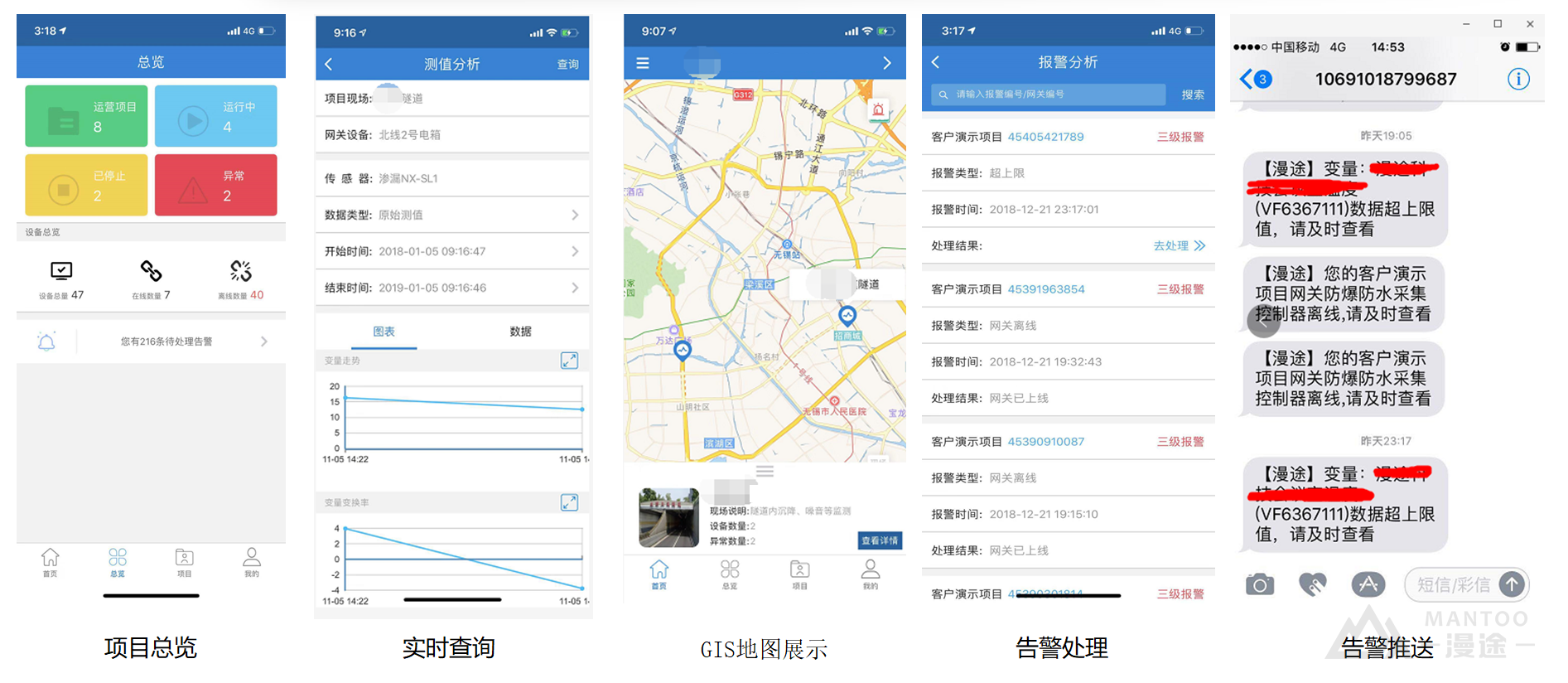 Mantoo cloud network remote measurement and control system control cabinet through the RS485 interface technology to collect the data of each sensor, through the 4G network directly uploaded diffuse cloud real-time view, once the data limit, on-site equipment failure, the remote control terminal will appear alarm information, remind personnel maintenance.