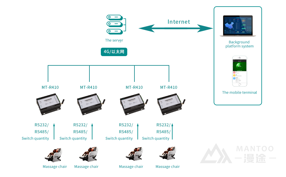 As an industrial Internet of things service provider integrating r&d and intelligent manufacturing capabilities in the Yangtze river delta region, mantu technology has developed a Shared massage chair cloud platform system integrating data collection, transmission and automatic control functions by using Internet of things technology and mt-r410 4G intelligent measurement and control terminal according to the company's needs. This product helps the company to solve the three problems of platform management, mobile terminal users' code scanning and selection package, and maintenance personnel repair work order, so that the company can effectively improve the use efficiency of massage chair and reduce the operation and maintenance costs.