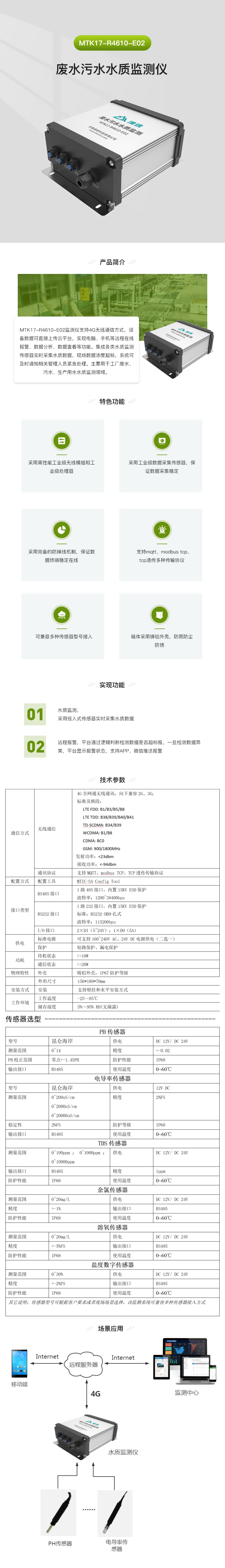 MTK17-R4610-E02監測儀支持4G無線通信方式,設備數據可直接上傳 云平臺,實現電腦、手機等遠程在線報警、數據分析、數據查看等功能。集 成各類水質監測傳感器實時采集水質數據,現場數據濃度超標,系統可及時 通知相關管理人員緊急處理。主要用于工廠廢水、污水、生產用水水質監測 領域。