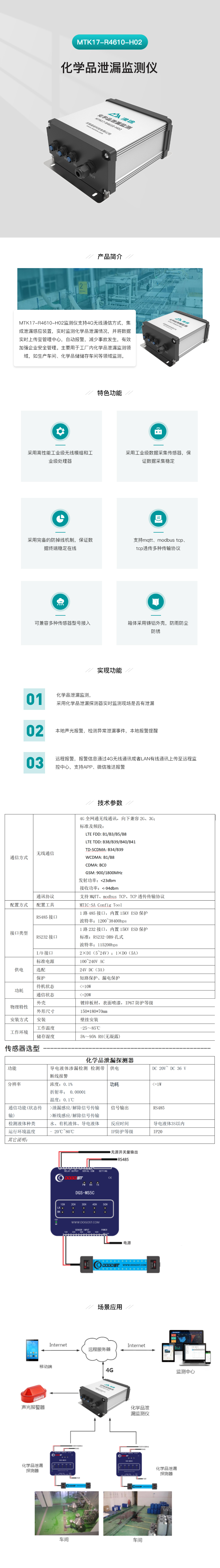 MTK17-R4610-H02監(jiān)測儀支持4G無線通信方式,集成泄漏感應(yīng)裝置, 實時監(jiān)測化學(xué)品泄漏情況,并將數(shù)據(jù)實時上傳至管理中心,一旦檢測到泄漏, 通知相關(guān)管理人員緊急處理,同時可聯(lián)動消防及報警裝置,自動報警,減少 事故發(fā)生,有效加強企業(yè)安全管理。主要用于工廠內(nèi)化學(xué)品泄漏監(jiān)測領(lǐng)域, 如生產(chǎn)車間、化學(xué)品儲儲存車間等領(lǐng)域監(jiān)測