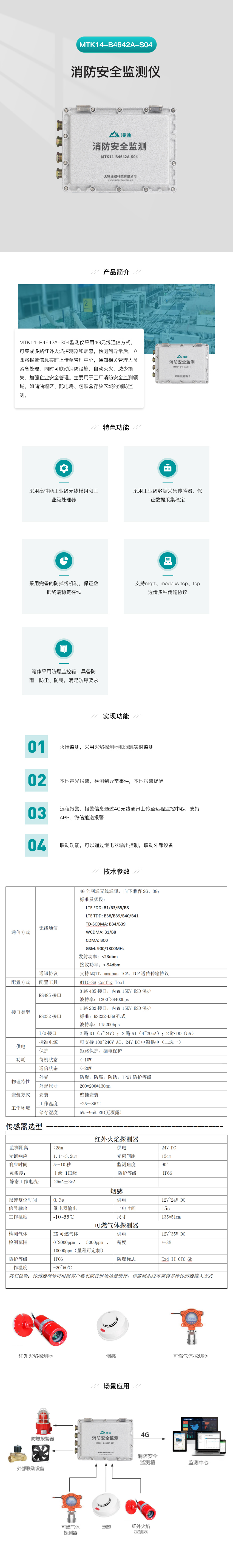 MTK14-SR411-S04監測儀采用4G無線通信方式,可集成多路紅外火焰 探測器和煙感,檢測到異常后,立即將報警信息實時上傳至管理中心,通知 相關管理人員緊急處理,同時可聯動消防設施,自動滅火,減少損失,加強 企業安全管理。主要用于工廠消防安全監測領域,如儲油罐區、配電房、包 裝盒存放區域的消防監測。