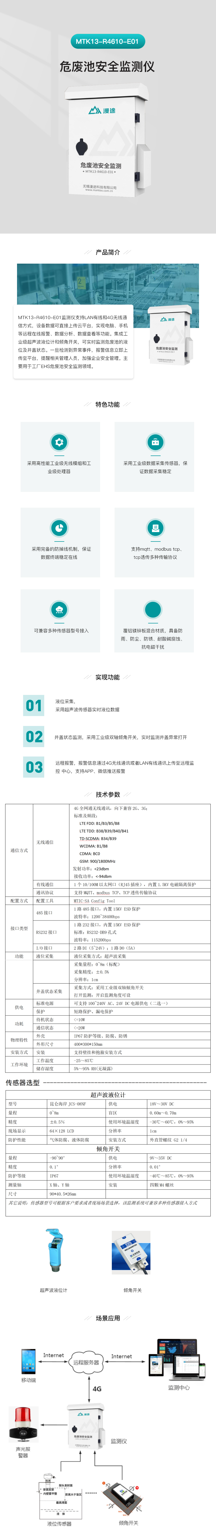 MTK13-R4610-E01監(jiān)測儀支持LAN有線和4G無線通信方式,設備數據 可直接上傳云平臺,實現電腦、手機等遠程在線報警、數據分析、數據查看 等功能。集成工業(yè)級超聲波液位計和傾角開關,可實時監(jiān)測危廢池的液位及 井蓋狀態(tài)。一旦檢測到異常事件,報警信息立即上傳至平臺,提醒相關管理 人員,加強企業(yè)安全管理。主要用于工廠EHS危廢池安全監(jiān)測領域。