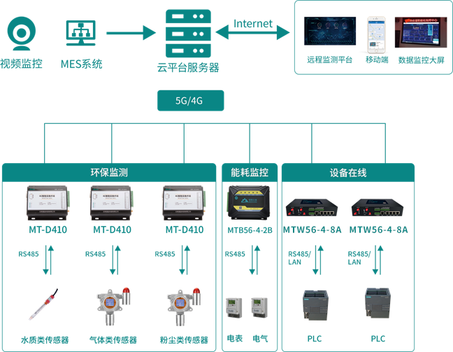 ●5G IoT智能網關MT-BOX:負責在線采集各類傳感器、電表/水表和PLC數據,通過5G無線通信通信接口實現數據上傳;同時支持和遠控設施進行聯動操作。