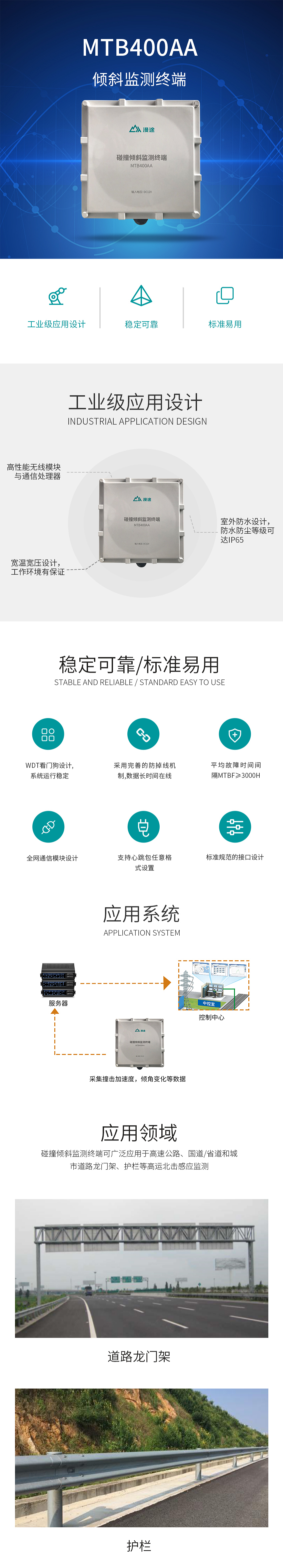 MTB400AA是一款集成了傾角檢測傳感器和4G無線通信模塊于一體的高性能采集裝置,可實現撞擊加速度、傾角變化等數據的在線采集,當采集數據發生數值超限時,結合漫途MTIC 3.0綜合云平臺實時推送報警信息,。該設備廣泛應用于高速公路、國道/省道和城市道路龍門架、護欄等高速撞擊感應監測場景。支持配合主管部門的監控系統使用。