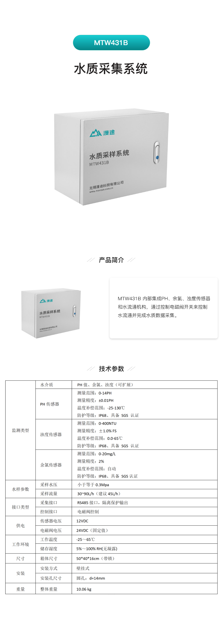 MTW431B 內部集成PH、余氯、濁度傳感器和水流通機構,通過控制電磁閥開關來控制水流通并完成水質數據采集。