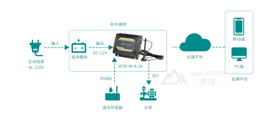 漫途科技作為長(zhǎng)三角地區(qū)集研發(fā)與智能制造于一體的智慧物聯(lián)網(wǎng)終端方案服務(wù)商,積極打造一套“漫途城市排水監(jiān)測(cè)預(yù)警系統(tǒng)”。該系統(tǒng)通過MTB-46-4-2A終端可實(shí)時(shí)在線監(jiān)測(cè)城市下水管道水位、涵洞水位、水浸點(diǎn)水位、河道水位等,當(dāng)這些地點(diǎn)出現(xiàn)險(xiǎn)情時(shí)會(huì)及時(shí)通知管理平臺(tái),通過手機(jī)APP、手機(jī)短信、現(xiàn)場(chǎng)聲光報(bào)警器等向城市管理者、廣大社會(huì)群眾通報(bào)險(xiǎn)情,及供決策者制定解決險(xiǎn)情的辦法,達(dá)到預(yù)警、減災(zāi)的目的。