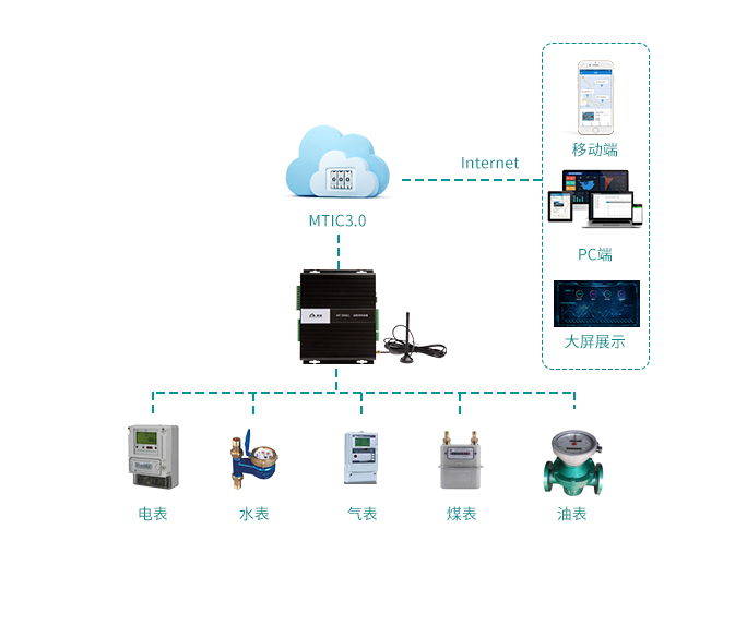 ※遠(yuǎn)程在線數(shù)據(jù)采集終端MT-BOX:負(fù)責(zé)在線采集電表、水表、氣表、油表以及煤表等傳感器設(shè)備,通過(guò)4G/NB-IoT等通信接口實(shí)現(xiàn)數(shù)據(jù)上傳。