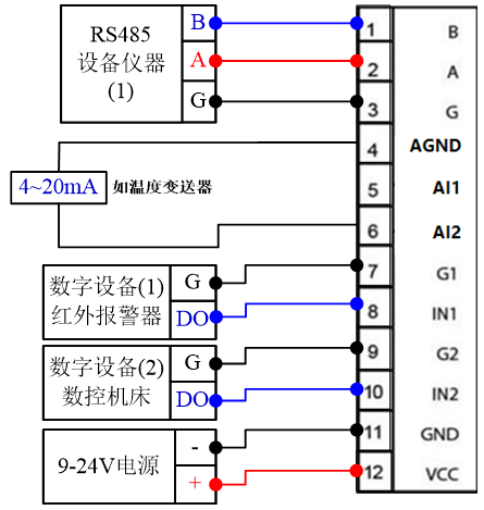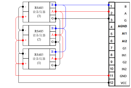 (2)多RS485設備時,采用“手拉手”接線方式;外接傳感器設備(RS485設備儀器)在電源與網關電源適配的前提下可以由網關供電。接線如圖2: