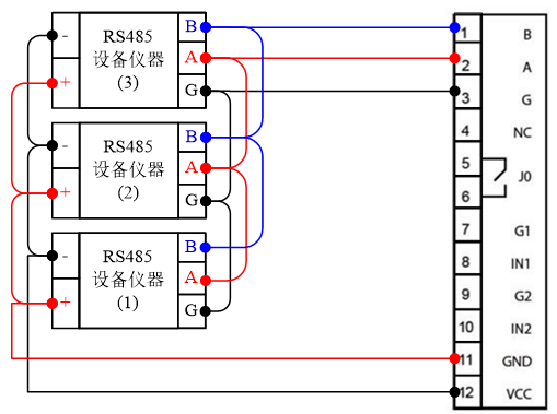 (2)多RS485設備時,采用“手拉手”接線方式;外接傳感器設備(RS485設備儀器)在電源與網關電源適配的前提下可以由網關供電。接線如圖2: