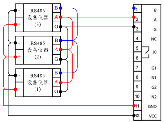 (2)多RS485設備時,采用“手拉手”接線方式;外接傳感器設備(RS485設備儀器)在電源與網關電源適配的前提下可以由網關供電。接線如圖2: