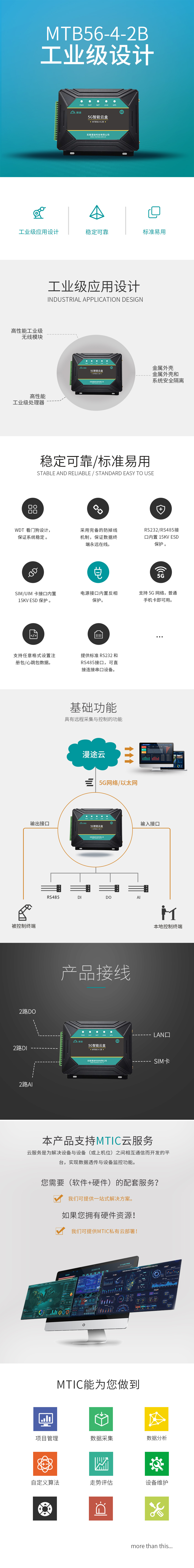 MTB56-4-2B無線遠程測控終端是集數(shù)據(jù)智能采集、協(xié)議轉(zhuǎn)換、全網(wǎng)通/5G無線通信、數(shù)據(jù)處理轉(zhuǎn)發(fā)、本地存儲等功能于一體的高性能測控裝置,可以直接接入各類具有數(shù)字量、開關(guān)量和模擬量接口的傳感器和智能終端。可以實現(xiàn)數(shù)據(jù)采集與遠程控制,支持本地自主決策及邏輯配置,支持協(xié)議自定義,匹配多應(yīng)用場景。