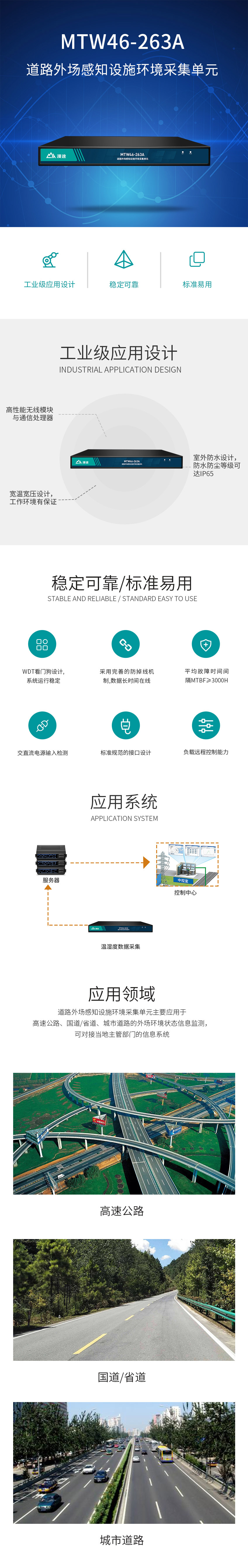 MTW46-263A是一款道路外場感知和環境監測設備,采集道路外場條件下一種或多種環境狀態信息,接收、解析、存儲、轉發采集單元相關數據的信息給到監控中心云平臺,實時統計外場環境信息,支持配合MTIC 3.0綜合云平臺使用,以大數據看板的形式展示區域內道路環境監測數據。主要應用于高速公路、國道/省道、城市道路的外場環境狀態信息監測,可對接當地主管部門的信息系統。