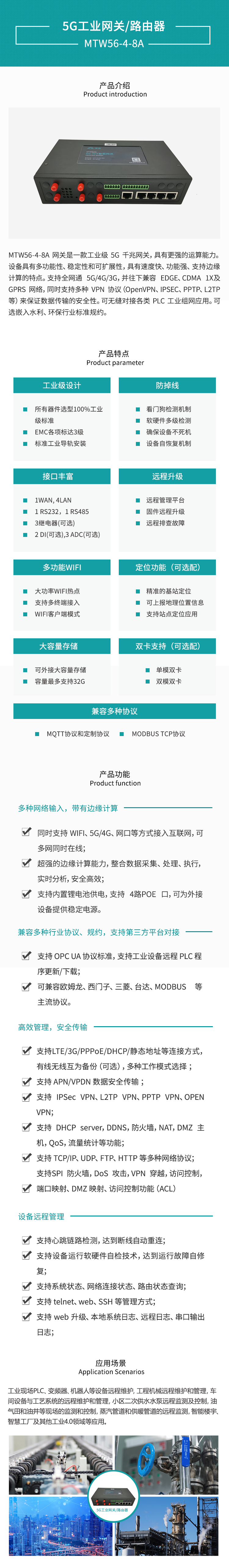 MTW56-4-8A網(wǎng)關是一款工業(yè)級5G千兆網(wǎng)關,具有更強的運算能力。設備具有多功能性、 穩(wěn)定性和可擴展性,具有速度快、功能強、支持邊緣計算的特點。支持全網(wǎng)通5G/4G/3G,并 往下兼容EDGE、CDMA1X及GPRS網(wǎng)絡,同時支持多種VPN協(xié)議(OpenVPN、IPSEC、PPTP、 L2TP等)來保證數(shù)據(jù)傳輸?shù)陌踩浴?/p>